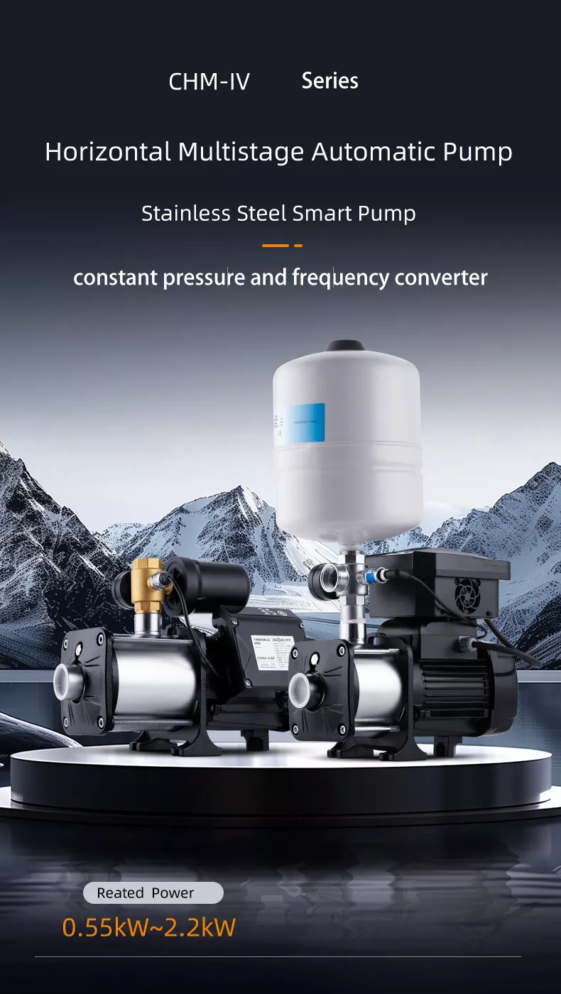 Horizontální vícestupňové odstředivé čerpadlo řady CHM20/IV řady inteligentních invertorů z nerezové oceli je v současnosti na trhu poměrně vyspělým produktem, který má kompaktní konstrukci a stabilní provoz, nízkou provozní hlučnost, účinnost až 44-70 %. Všechny součásti procházející vodou jsou vyrobeny z nerezové oceli AISI304. Je široce používán v