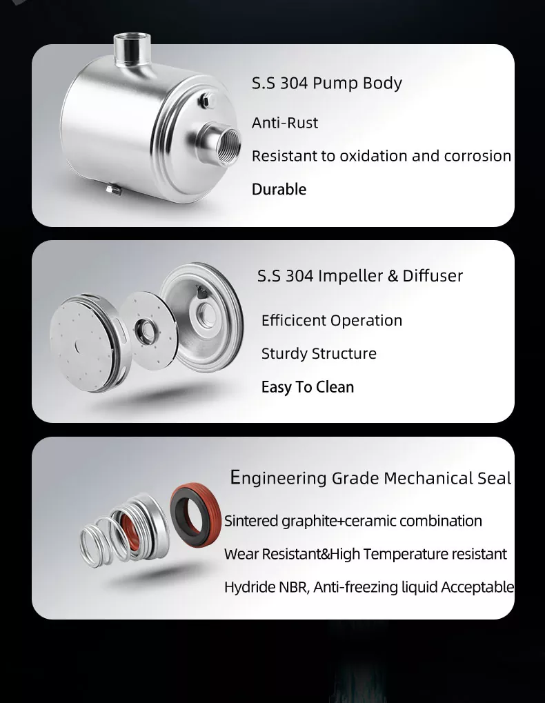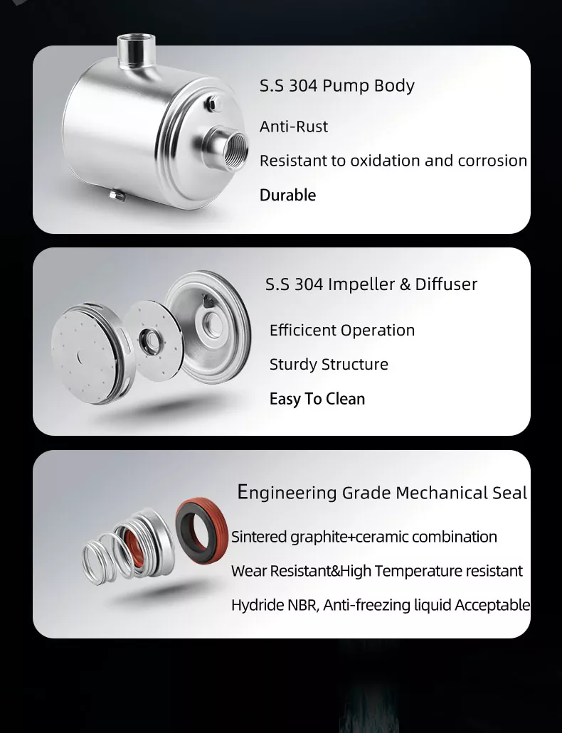 3. Všestranné použití: Ať už potřebujete zvýšit tlak vody v budovách, zavlažovacích systémech nebo průmyslových procesech, toto čerpadlo je dostatečně univerzální, aby snadno splnilo širokou škálu potřeb.