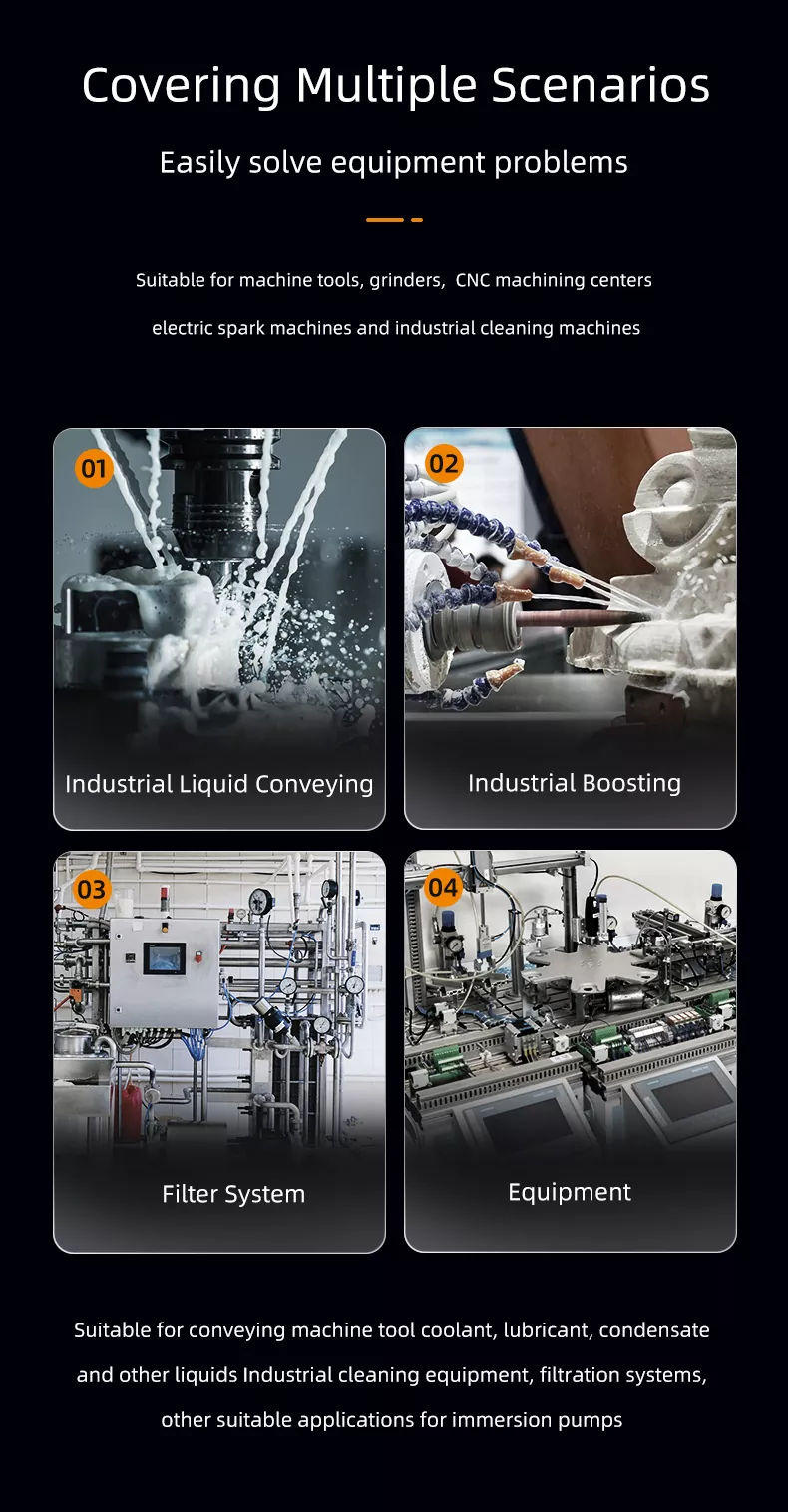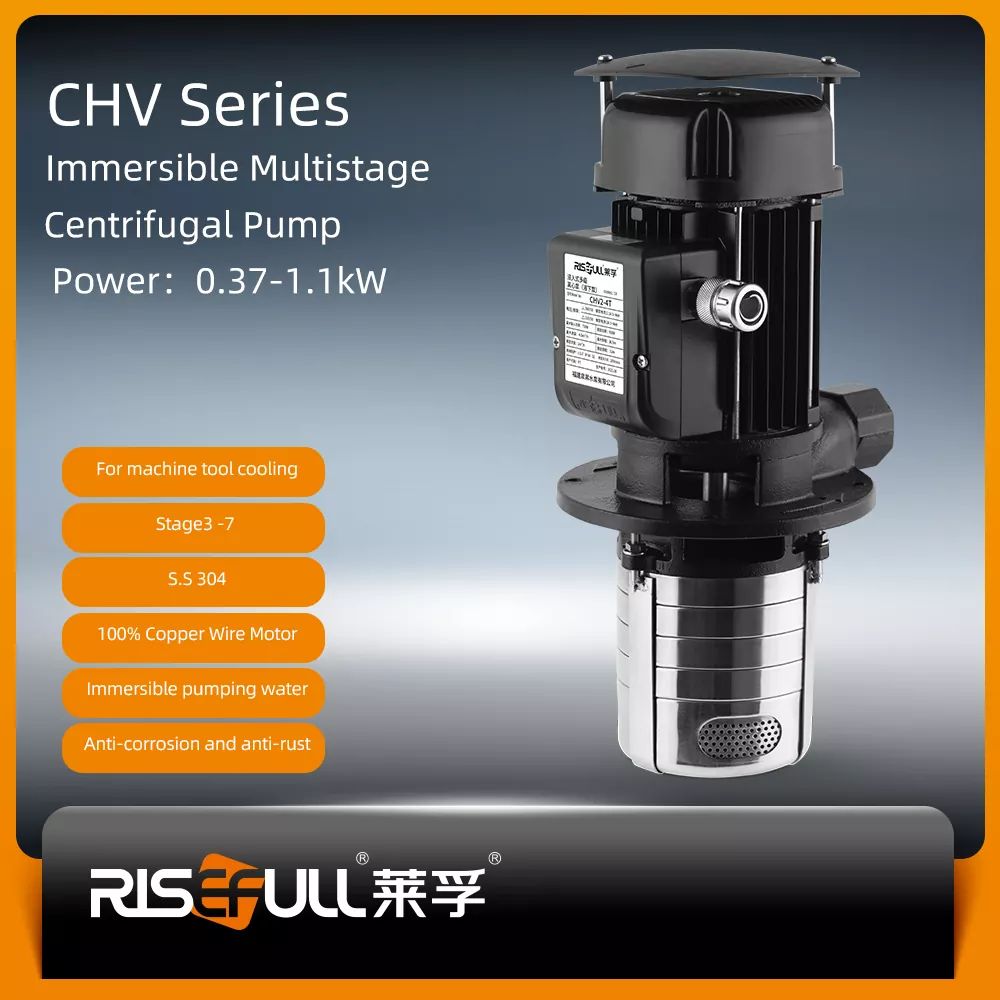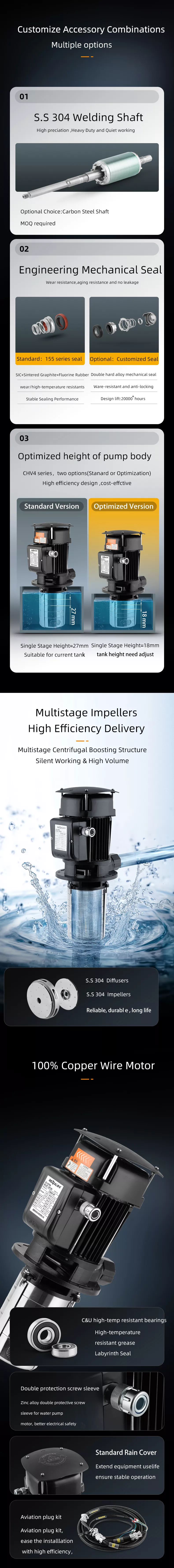 Následuje představení řady CHV Ponorné vícestupňové odstředivé čerpadlo CHV, také známé jako ponorné čerpadlo nebo strojní topné čerpadlo, se používá pro dopravu chladicí kapaliny obráběcích strojů, maziva, přenosu kondenzované vody, průmyslových čisticích zařízení, filtračních systémů a dalších aplikací vhodných pro použití s ponornými čerpadly. Je ideální pro integraci s obráběcími stroji, bruskami, CNC obráběcími centry, EDM stroji, průmyslovými čisticími stroji a dalším vybavením.