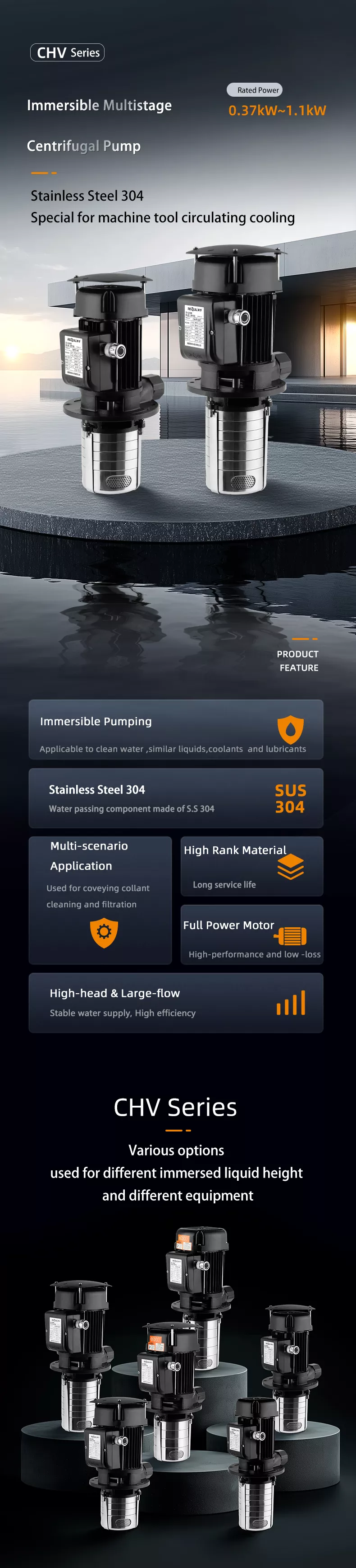Následuje představení řady CHV Ponorné vícestupňové odstředivé čerpadlo CHV, speciálně navržené pro čerpání chladicích maziv pro obráběcí stroje a pro montáž na horní část nádrží se sestavou čerpadel ponořenou v čerpané kapalině. Čerpadla STAIRS SBK jsou k dispozici s různými velikostmi čerpadel a různým počtem stupňů pro zajištění požadovaného průtoku, tlaku a délky.